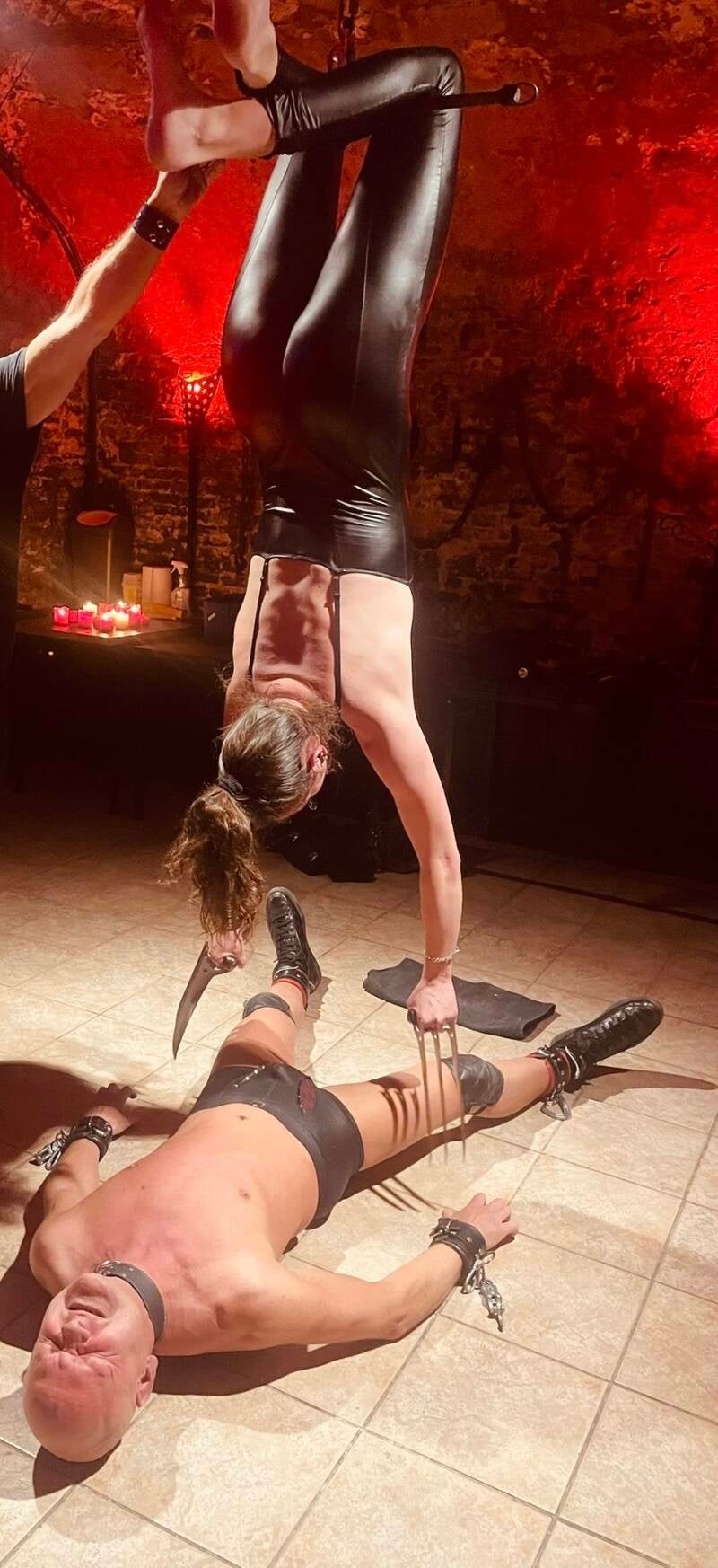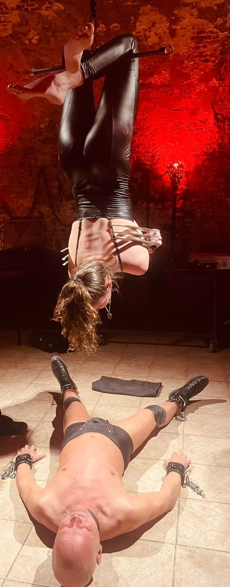De driehoek wordt vervangen door een andere, metalen stang. Ik verwacht dat ze ook die gaat gebruiken om haar evenwicht te kunnen bewaren wanneer ze hem trampelt (over zijn lichaam loopt). Niets blijkt minder waar te zijn. De Domina gaat recht voor de stang staan en plaats haar handen aan weerszijden van de stang. Ze zet af van de grond en vouwt haar benen om de stang.